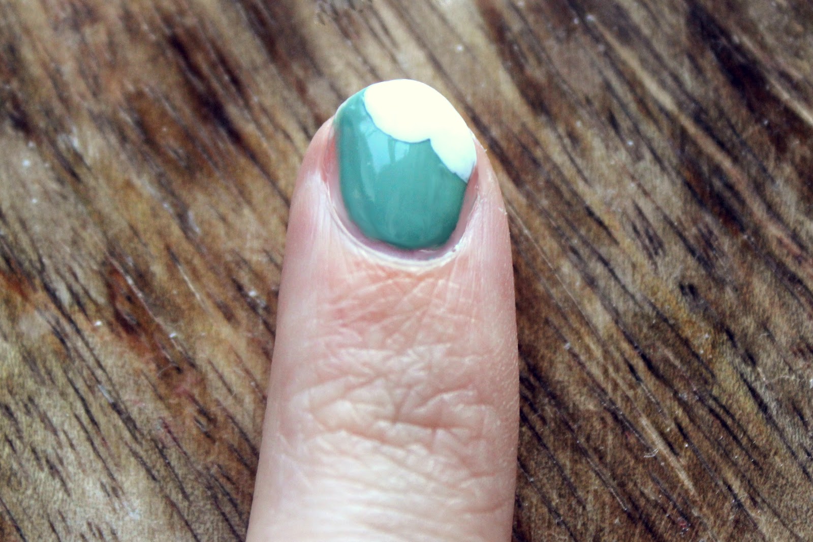 Das Prinzip ist eigentlich ganz einfach. Erst hellblauen oder türkisen Lack auf den ganzen Finger auftragen. Dann wie eine zweibauchige Wolke auf den Finger malen, damit das ganze so aussieht: