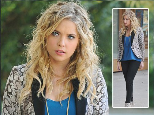 Und zwar habe ich in der letzten Folge Pretty Little Liars die ganze Zeit den Blazer von Hanna mit staunenden Augen begutachtet. Was an dem Blazer so besonders war? Er hatte Schlangenhautmuster. Jaaaaa, iiiiiih, ich weiß. Der Teufel in meinem Kopf heult gerade laut auf. Aber das sah sooo cool aus, kombiniert mit einem blauen Shirt drunter, seht selbst:
