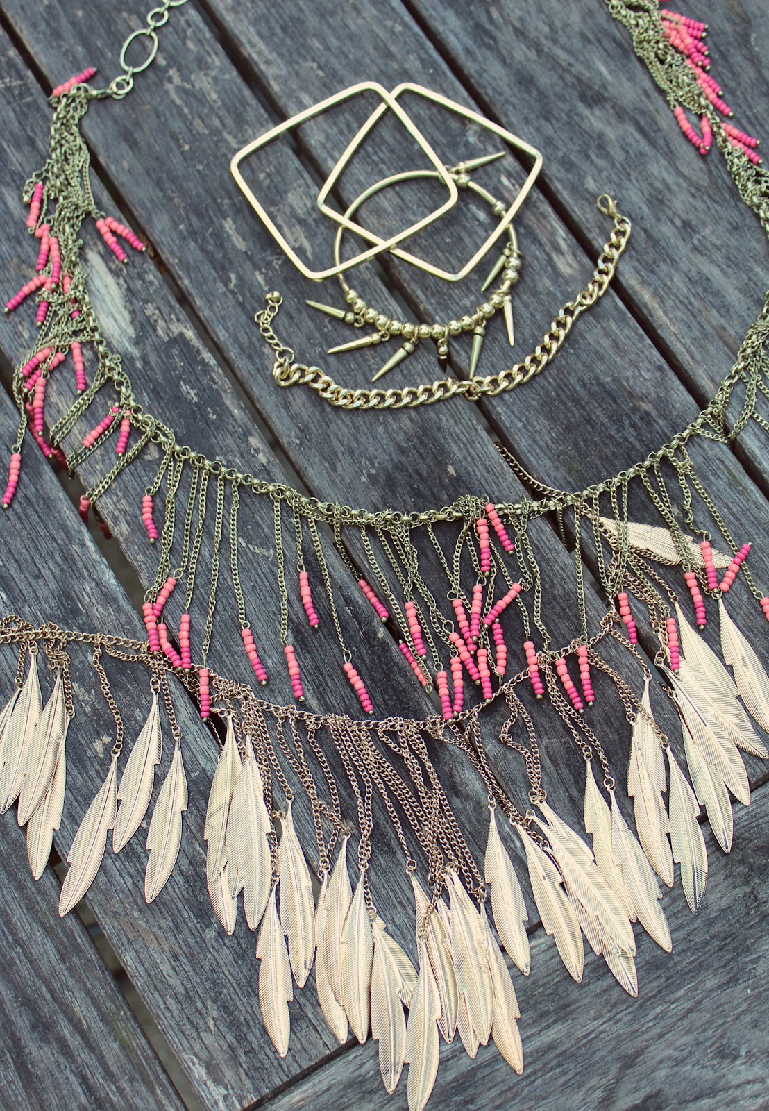 Federkette von Aldo, Statementkette mit rosa Perlchen von River Island und goldene Armreifen von Topshop