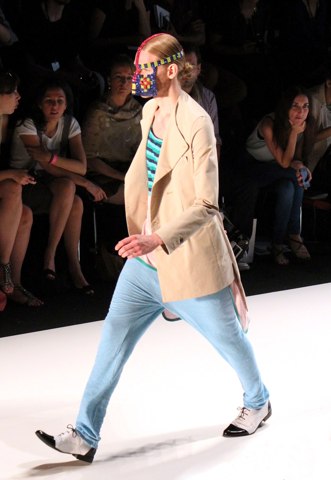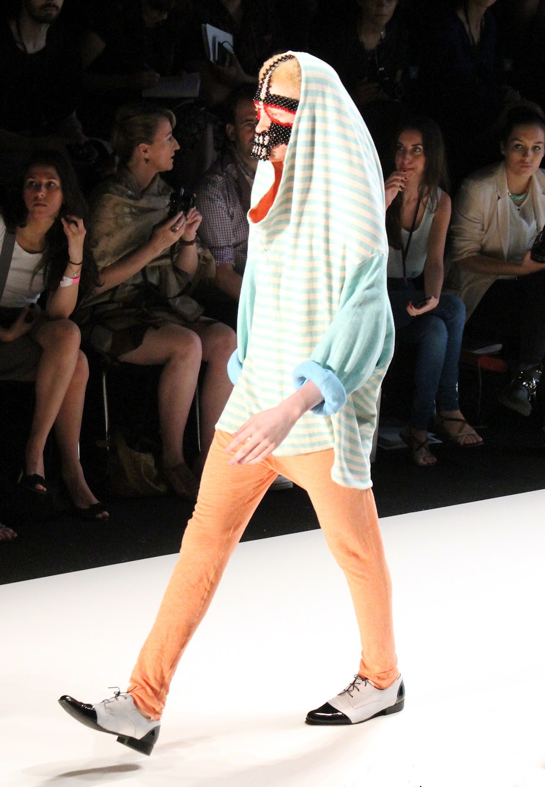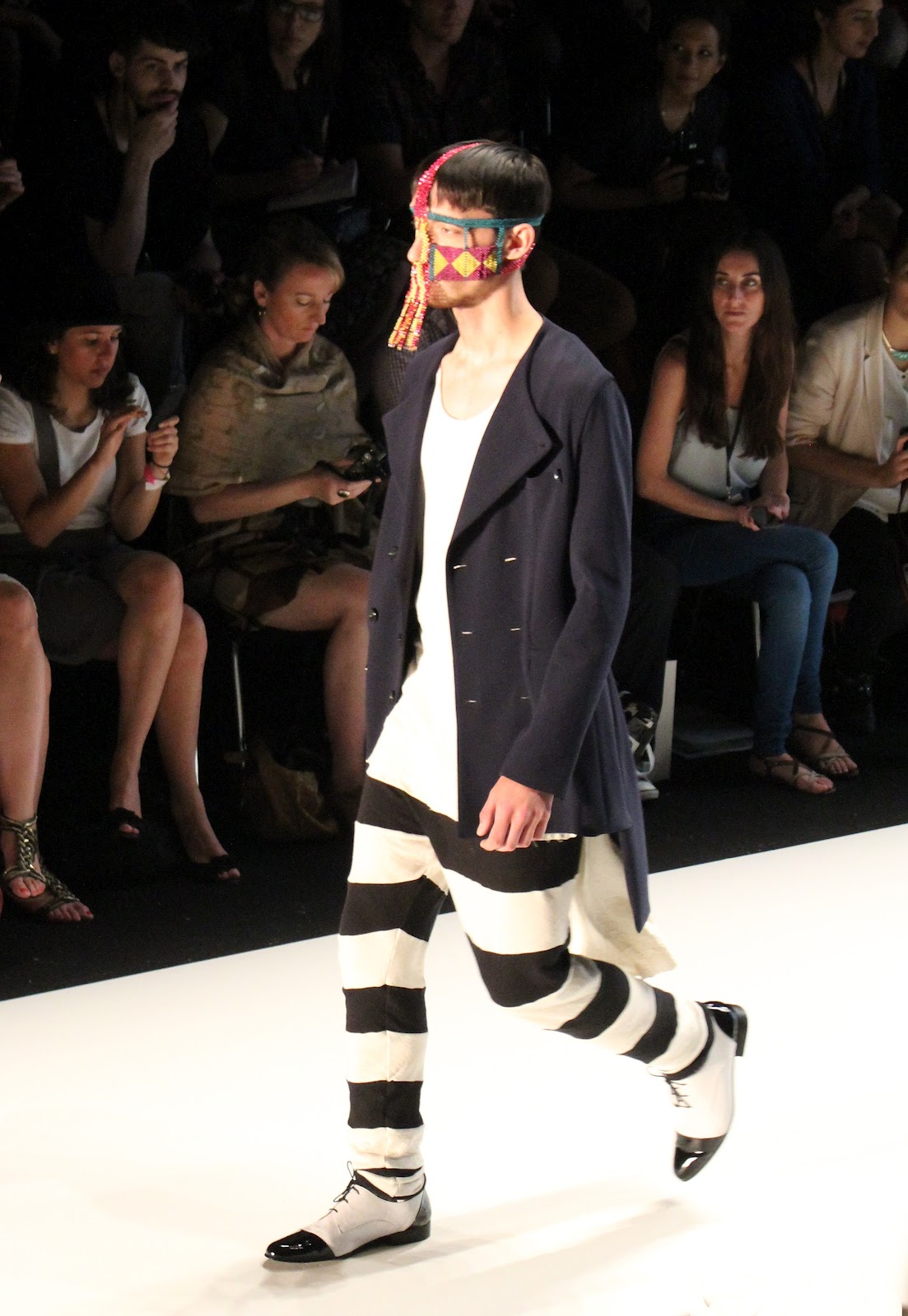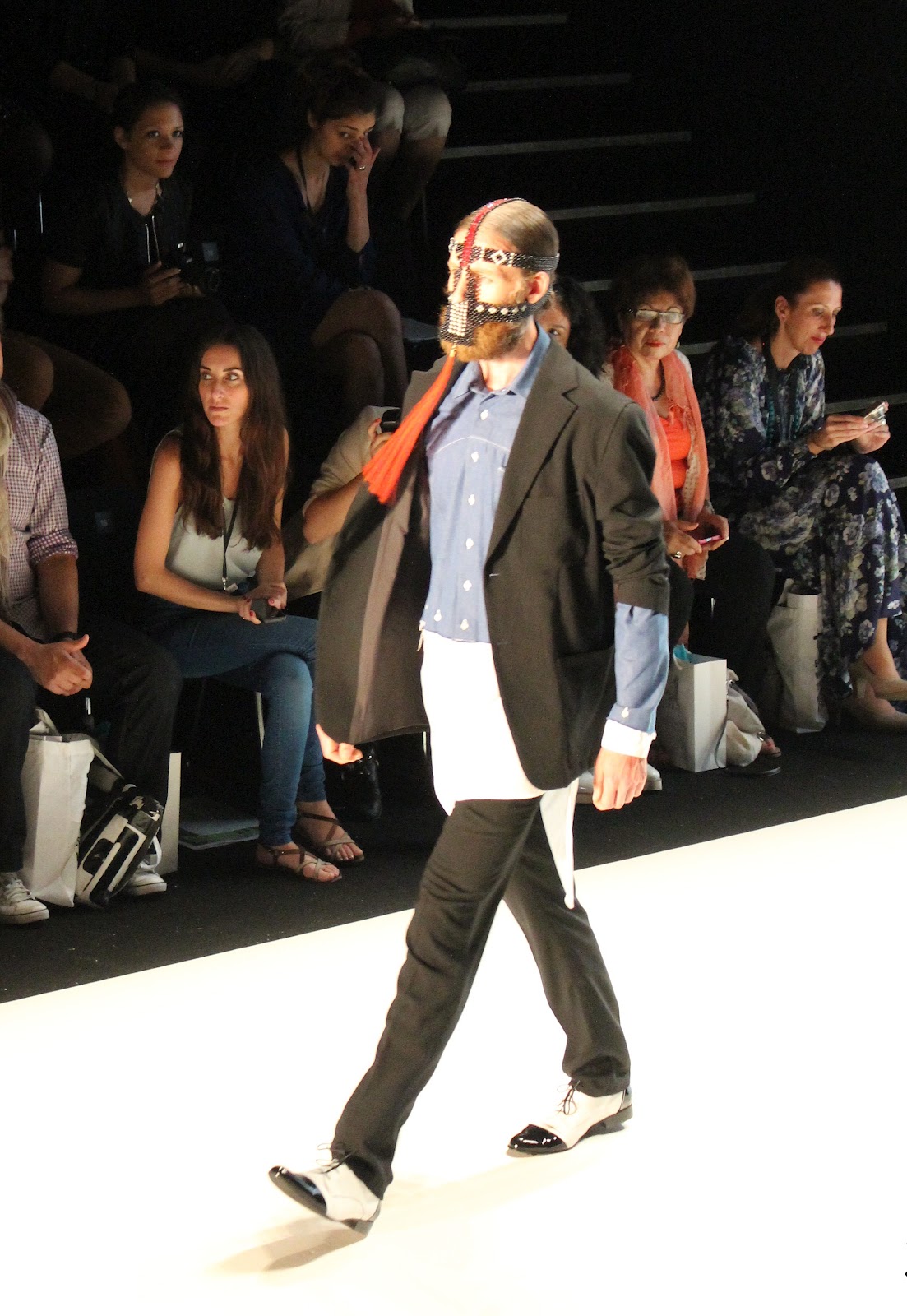 An jeder Fashion Week muss man meiner Meinung nach mindestens eine Show anschauen, bei der man überhaupt nicht kapiert, was zum Teufel der Designer da veranstaltet hat. Mit abartiger Musik, die einem das Blut in den Adern gefrieren lässt und einem Beat, der für Herzaussetzer sorgt, ging die Runway-Show der Männerkollektion SS 2013 von Romanian Designer Twenty(2)Too los. Das Konzept des Model-Castings war schnell durchschaut, denn es gab drei Kriterien, von denen das (männliche) Model möglichst viele erfüllen sollte: einen irren Psychoblick auf Kommando aufsetzen können, einen Vollbart besitzen und/oder lange Haare haben. Irgendwie fand ich die ganze Show zwar sehr skuril, aber gleichzeitig auch total faszinierend. Was im Kopf eines solchen Designers vorgeht, würde ich gerne mal wissen 😉