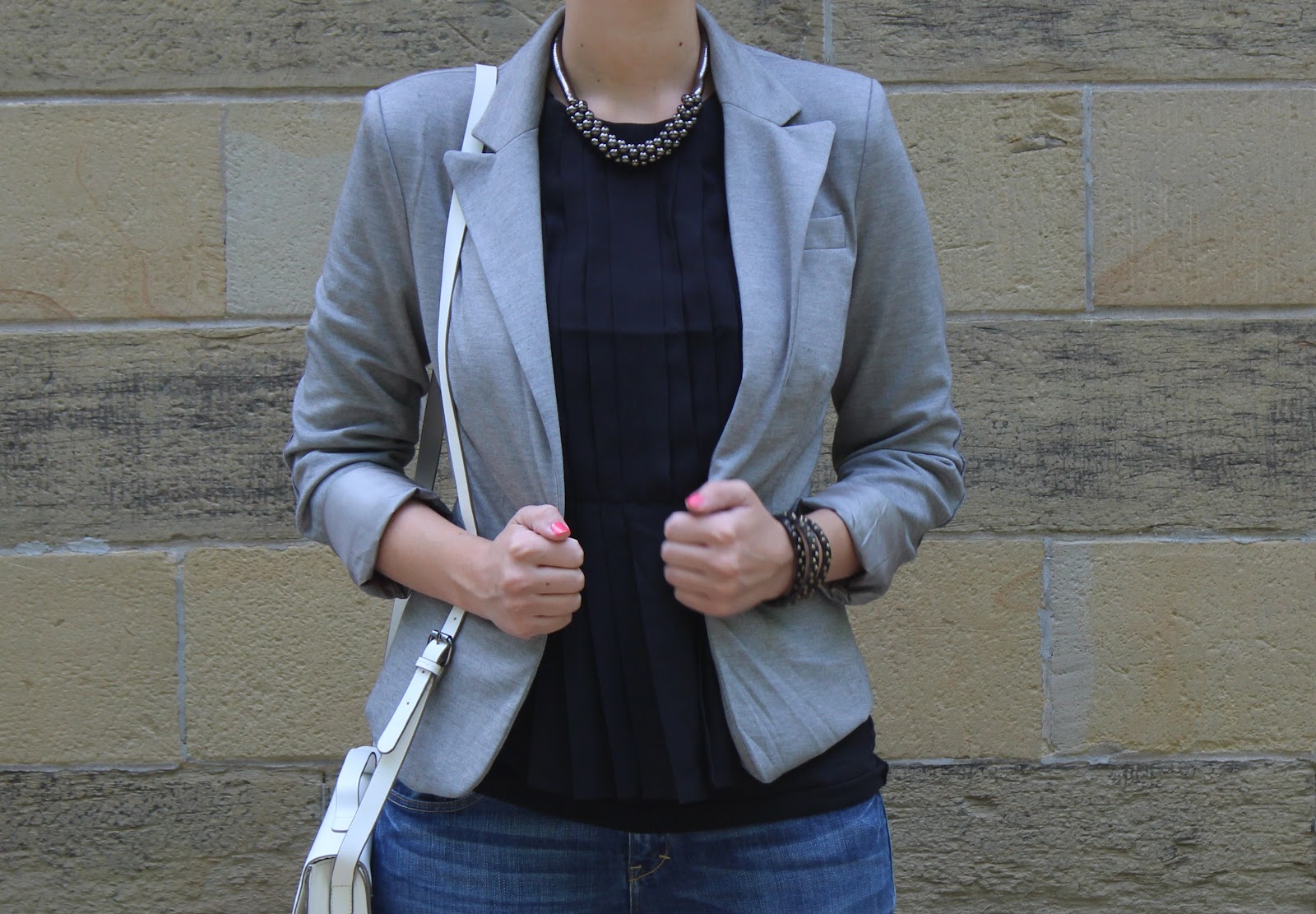 Was ich an Blazern am allermeisten mag ist, dass man sie so vielseitig kombinieren kann. Erstens Mal gibt es sie in allen erdenklichen Farben (und ich wage zu behaupten, etwa die Hälfte davon zu besitzen) und zweitens sind sie einfach für jeden Anlass die richtige Wahl. Natürlich verleihen sie jedem Outfit etwas mehr „chic“-ness, aber sie werten gerade sportliche Outfits enorm auf. Wenn ich mir also in Jeans, Top und Sneakern zu underdressed vorkomme, packe ich einfach noch einen Blazer dazu. In der Kombi mit weiß und schwarz gefällt mir besonders grau supergut – daher war ich froh und dankbar, dass mir neben der tollen schwarzen Chiffon-Bluse auch noch der graue Blazer von Zalando zugeschickt wurde.