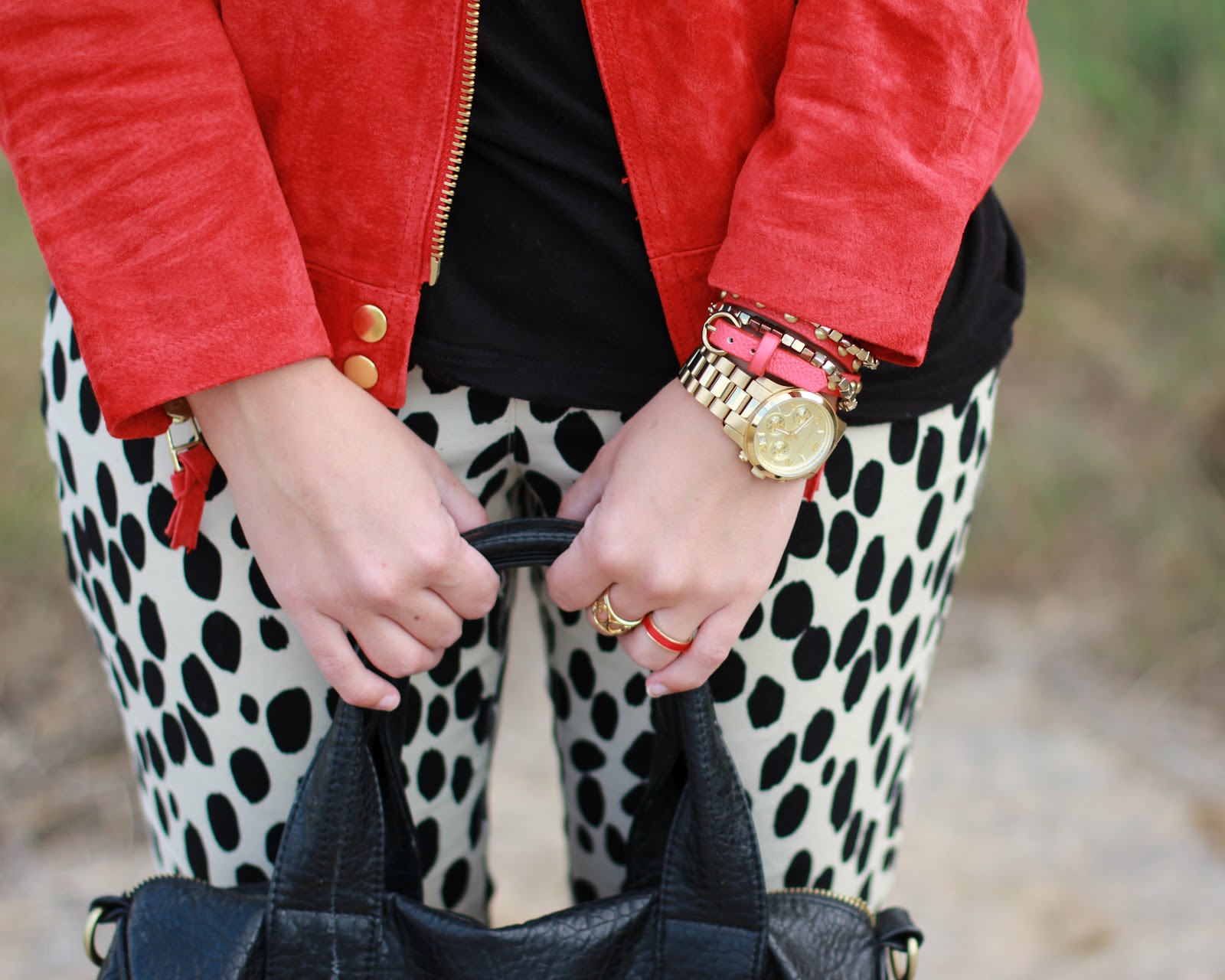Ein Löwe kann ja eigentlich nicht gepunktet sein, aber im heutigen Outfit wird das möglich. Das Outfit ist eigentlich ein Zusammenmischung aus ganz vielen Teilen, die von mir lange heißersehnt waren. Die Jacke habe ich bereits in der letzten Saison angestiert, als jeder sie in diesem Braunton gekauft hat. Aber so eine rote Wildlederjacke hat mich dann doch mehr gereizt und so war ich froh, dass ich noch ein Jährchen gewartet habe und sie jetzt in rot ergattern konnte, statt in braun. Die Hose ist ebenfalls so ein Fall von Will-Haben. Ich habe sie vor Wochen schon in der Heidelberger Altstadt ein einem Mädel gesehen und fand sie total geil. Aber da wusste ich noch gar nicht, wo es sie gibt. Dann sah ich sie im H&M-Onlineshop und kaufte sie mir aus bislang unbekannten Gründen nicht. Bis ich beschlossen habe, dass ich sie doch ganz unbedingt haben muss, war sie online natürlich ausverkauft und ich musste in die Stadt stiefeln, wo ich sie mir glücklicherweise noch angeln konnte.