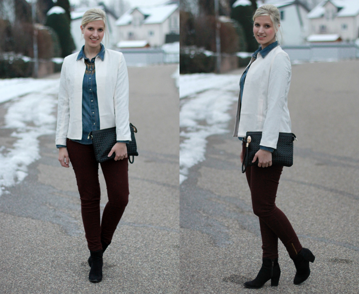 I’ve been searching for a perfect white blazer for a long time now and finally, I found one I really like. I wanted one without the typical blazer-collar and without buttons – try to find this when you’re really looking… I combined it with a jeans shirt and burgundy pants and added some black details.