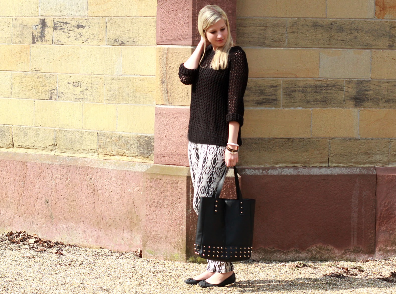 Bei mir ist das besondere Teil diesmal eine gemusterte Hose, die es gerade mal für zehn Groschen beim Schweden zu kaufen gibt (im Onlineshop konnte ich sie spontan gerade nicht entdecken, im Laden habe ich sie aber schon mehrfach gesehen). Gemusterte Hosen sind so eine Sache für sich: ich finde, dass sie ganz oft fehl am Platz sind und wenn man nicht gerade eine Größe 34 trägt (was ich nicht tue) kann es manchmal ganz schön (wortwörtlich) in die Hose gehen. Und selbst bei den Size-Zero Damen kann es vorkommen, dass die Hosen ganz schön unvorteilhaft auftragen. Aber es gibt auch andere Fälle und ich persönlich finde (hoffe), dass ich es mit meiner Hose ganz gut getroffen habe – dafür trägt bei mir der Pullover ein bisschen auf 😉 – aber solange es noch nicht ganz warm ist, dürfen Stricksachen auch auftragen.