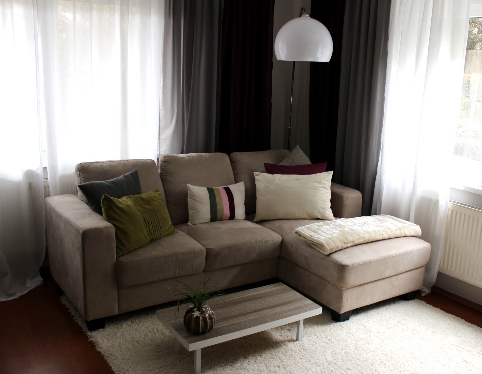 Des einen Leid ist des anderen Freud – so sagt man. Der ein oder andere kann sich vielleicht noch daran erinnern, dass ich im letzten Spätjahr auf der Suche nach einem Regal war (klick). Leider war die gewünschte Reihe ausverkauft, als ich mich endlich für die große Variante entschieden hatte (wir kennen mich und meine Problematik mit ausverkauften Dingen ja bereits). Da ich nicht auf der Suche nach etwas anderem, bestimmten war, stöberte ich also mit meinem Gutschein durch den Shop und fand eine wunderschöne Bogenlampe. Ich erinnerte mich an meine liebe Schnecke (das ist meine Freundin), die gerade umgezogen und dabei war, ihre erste komplett allein bewohnte Wohnung einzurichten. Sie hatte mir von einer silbernen Bogenlampe mit weißem Schirm vorgeschwärmt, hatte sich sogar schon ein Modell ausgesucht – der Kauf musste dann aber auf Eis gelegt werden, weil sie einen Steinschlag in ihrer beheizbaren Frontscheibe hatte und diese komplett ausgetauscht werden musste. Dank der Scheibenheizung kostet so eine neue Windschutzscheibe einen Haufen Geld, das nötige Kleingeld für die Lampe fehlte also. Da ich neben einem Kissen sonst nichts unbedingt brauchte, bestellte ich ihr kurzerhand die Lampe mit, die sie von mir dann als verspätetes Weihnachtsgeschenk überreicht bekam – die Freude war entsprechend groß.