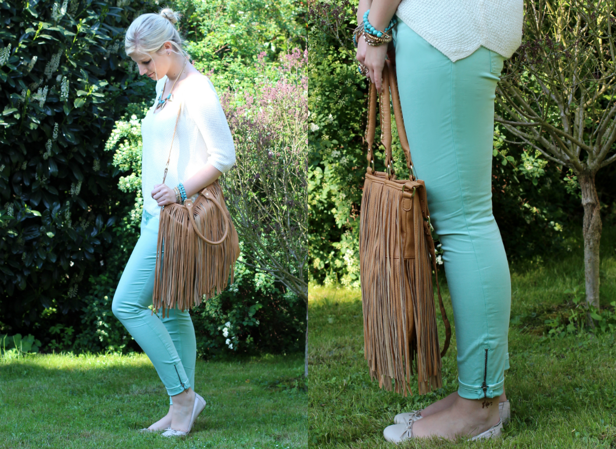 Ich glaube was man nicht sieht: die Tasche ist an sich auch tatsächlich so lang wie die Fransen. Wenn ich mir die Fotos so anschaue, dann sieht es irgendwie aus als wäre es nur ein kleiner Beutel mit doppelt so langen Fransen – in echt schließen die aber mit dem Taschenboden ab. Es würde also glaube ich NOCH komischer aussehen, wenn die Fransen auf der Hälfte der Taschen aufhören würden… aber Fransen sind glaube ich wirklich nicht jedermann's Fall… Ab und an wirst du sie aber sicher noch zu sehen bekommen 😉