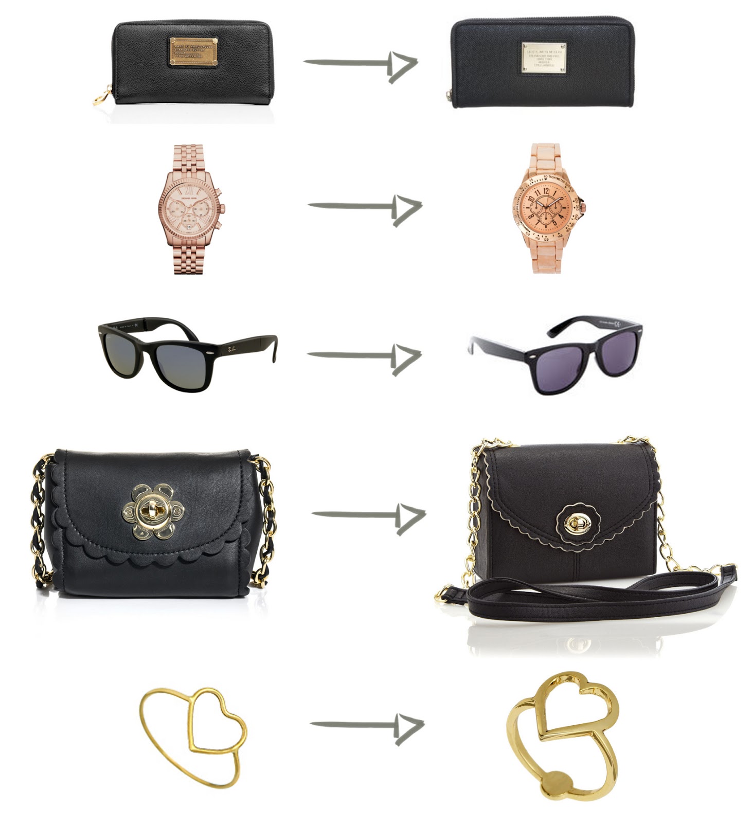 Wer kennt das nicht: das Ende des Monats ist noch lange nicht erreicht und ein Blick auf das Konto zeigt nichts als gähnende Leere. Dabei ist da doch dieser schöne Geldbeutel von Marc Jacobs, dessen Kauf man sich schon seit Monaten überlegt hat und die Tasche von Alexander Wang ist ja auch so wunderschön. Designerstücke (oder generell etwas teurere Teilchen) sind einfach eine verlockende Sache, finde ich. Es gibt aber sicherlich genügend unter euch, die von einem Studenten- oder Schülereinkommen leben und für die trotz striktem Sparens solche Designersachen einfach nicht drin sind. Andere wiederum sehen den großen Geldbetrag nicht ein, auch wenn dessen Aufbringung dank der Einküfte kein riesengroßen Problem wäre. Es gibt also viele verschiedene Gründe, wieso man nicht immer zum teuren Originalprodukt greifen kann (oder will) und heute möchte ich all denjenigen, die trotzdem nicht auf die Optik verzichten wollen, ein wenig auf die Sprünge helfen. Denn es gibt sie, die günstigen und preiswerten Alternativen zu den teuren Designersachen – die oft tatsächlich sehr ähnlich aussehen! Und davon möchte ich euch heute ein paar zeigen. Habt ihr Lust, dass ich mich öfter mal auf die Suche nach günstigeren Möglichkeiten mache?