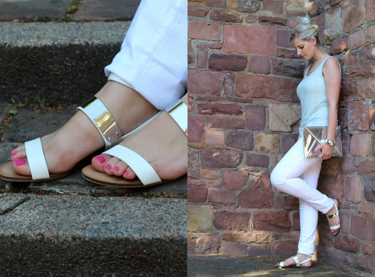 Der heutige Look ist ja eigentlich mit einem kleinen Augenzwinkern an meine beste Freundin Chri zu verstehen. Kürzlich machten wir uns bei ihr für eine Strandparty fertig und sie legte mir einige Oberteile und Hosen raus und fragte nach meiner Meinung. Gezielt griff ich zu einer weißen Hose und einem mintgrünen, perlenbesetzten Top (jenes welches ihr auf den Fotos seht). Als sie ins Outfit geschlüpft war, sagte ich etwas wie Das Top ist schön. Jetzt siehst du aus, wie ich gerne aussehen würde! Somit freute sich die Chri und ich begaffte den ganzen Abend ihr Outfit, insbesondere das Top. Und noch bevor mir Chri zu Ende erklärt hatte, dass das Oberteil im Sale ist und ich ja am Montag in der Stadt danach gucken könnte, landete die Bestellbestätigung schon in meinem Postfach und ich legte grinsend mein Handy zur Seite und dankte kurz der H&M-App. Hätten wir das also auch geklärt. Das heutige Outfit ist also in freundschaftlicher Arbeitsteilung entstanden. Das Top ist einfach wunderschön, weil es so edel ist, ohne dass es groß etwas anderes braucht. Um den kühlen Farben noch eins draufzusetzen, hab ich einfach noch ein bisschen Silbermetallic dazugepackt und fertig ist das Ding. Wie gefällts euch?
