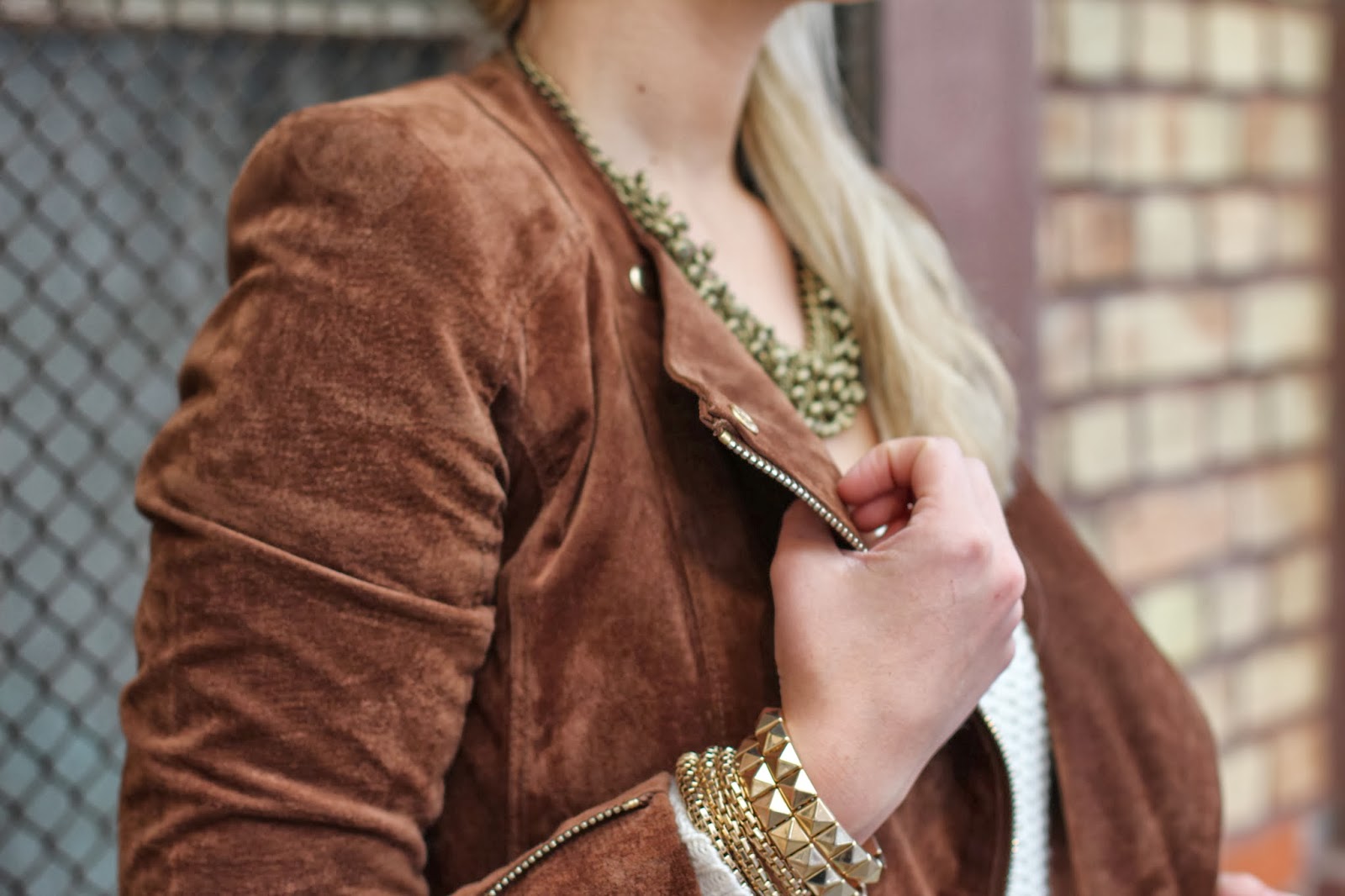 Die Jacke war so eine Sofort-Verliebt-Aber-Natürlich-Pech-Geschichte, denn natürlich war sie – ihr könnt es euch denken – ausverkauft, als ich mich dann endlich für den Kauf entschieden hatte. Im Umkreis habe ich fünf Mango-Stores angerufen und gefragt, ob sie dort noch im Sortiment ist (übrigens: das nenne ich mal einen freundlichen Kundenservice! Obwohl ich in Läden angerufen habe, die für gewöhnlich recht gut besucht sind, wurde mir wahnsinnig ausführlich geholfen – man erkundigte sich genau nach der Jacke, wir berieten uns über Artikelnummern und ich bekam Tipps, wo ich vielleicht noch schauen könnte), natürlich hatte ich aber Pech. Selbst in München, wo ich einen spontanen Wochenendbesuch hinlegte, fand ich die Jacke nicht mehr. Inzwischen ist sie wieder online verfügbar und ich habe in der ersten Sekunde zugeschlagen und mir die Jacke unter den Nagel gerissen. Wenn ihr nach einer wunderbar angenehmen Wildlederjacke sucht, lege ich euch dieses Modell wirklich ans Herz, keine meiner Lederjacken weist eine vergleichbar gute Qualität auf.