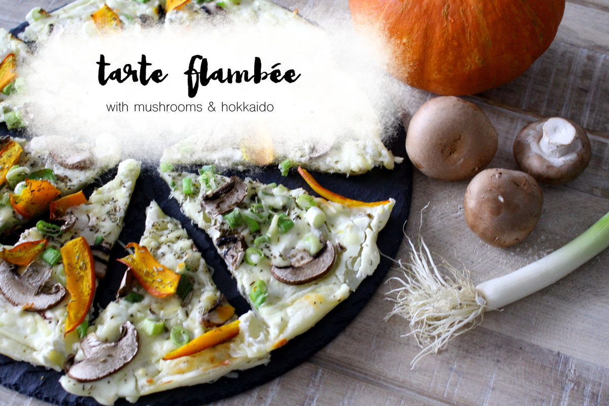 Gut also, dass der heutige Post kein Suppenrezept ist und wir trotzdem einen ganzen Absatz lang darüber philosophiert haben. Aber weil es jetzt halt überall Hokkaido gibt und ich eine von den kürbisverrückten Tanten bin (wirklich, ich würde die Dinger wie einen Apfel essen – wenn sie nicht ungekocht ziemlich hart wären…), muss ich euch jetzt eben schonmal was anderes herbstliches zu Essen zeigen: einen Flammkuchen mit Hokkaido und Pilzen.