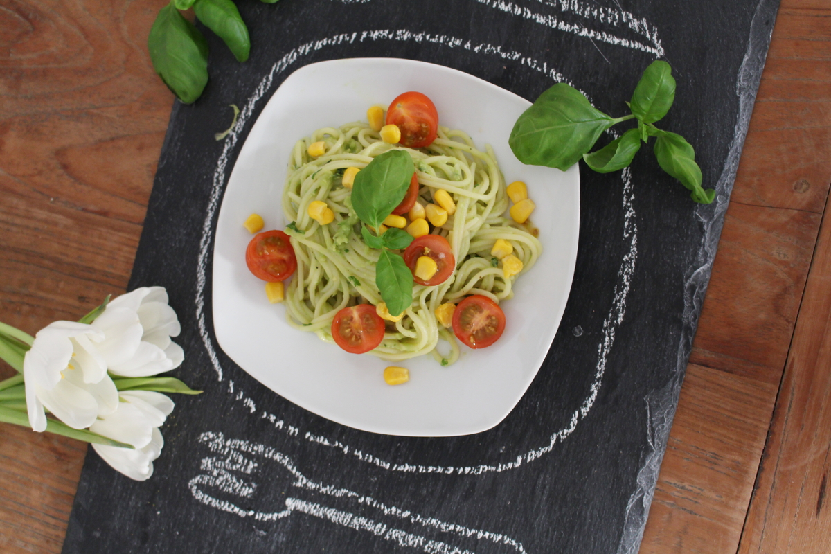 5. Direkt verzehren, da die Avocadosauce und das Gemüse kalt sind. Sonst kühlen die Spaghetti zu schnell aus.