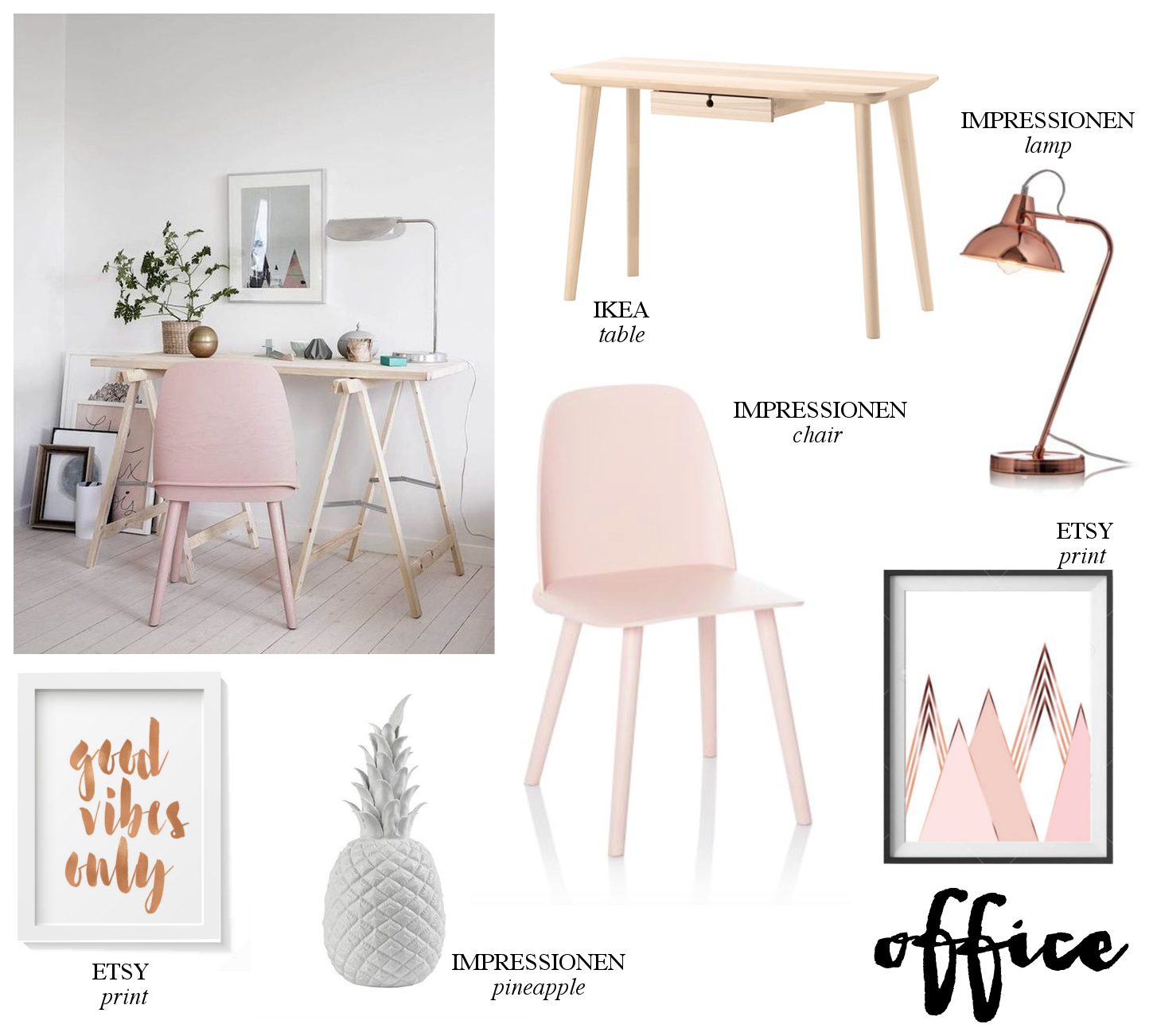 Schreibtisch – IKEA // Stuhl – Impressionen // Lampe – Impressionen // Print ‚Good Vibes Only‘- Etsy // Print Dreiecke – Etsy // Ananas – Impressionen