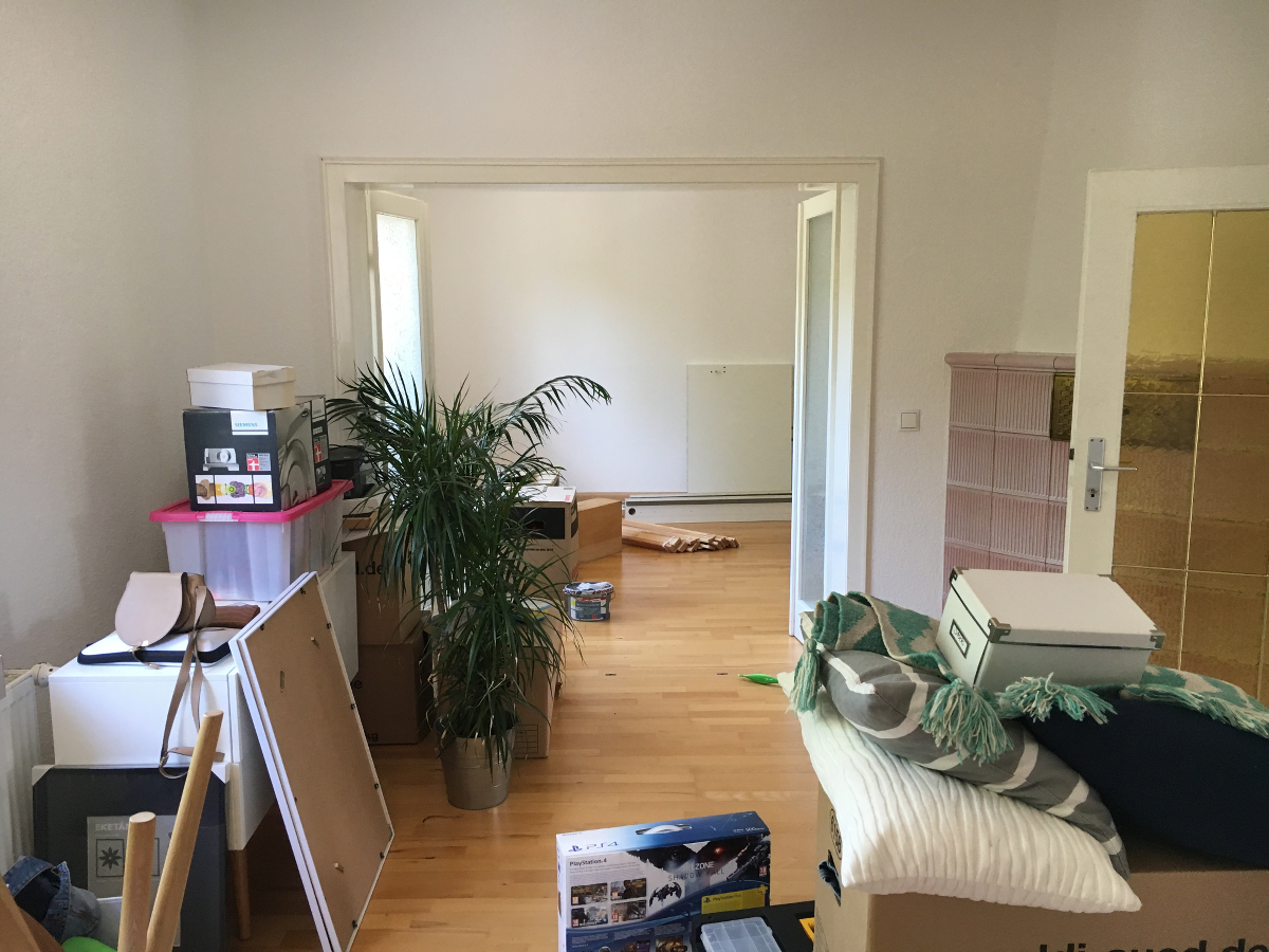 Eine kurze Krise gab es beim Einzug dann direkt schon, denn mein Freund findet meinen Esstisch – das gefühlt einzige Möbelstück, bei dem wir uns einig waren, dass es unbedingt bleiben muss – zu groß für die Küche, die wir somit nicht nur zum Kochen, sondern direkt auch als Esszimmer mitnutzen wollten. Platz ist eigentlich genug, nur eben irgendwie doof. Erst war ich völlig ratlos, als dann mein Freund meinte Muss er halt weg! bin ich an die Decke gegangen. Der Tisch ist ein antikes Einzelstück und mein ganzer Stolz. Nach einigem Rumschieben und einer Nacht drüber schlafen steht der Tisch jetzt aber doch so, wie er ursprünglich geplant war und da bleibt er auch. Auch wenn er ein bisschen groß ist. Jetzt stehen hier also überall Kartons, Kisten, platzlose Möbel und Kram. Jetzt fängt mein Lieblingsteil an: Einrichten!